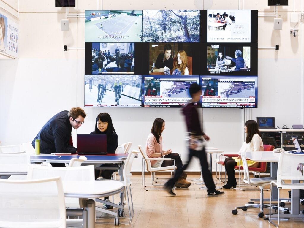 多摩キャンパスにはGスクェア(G Square)という異文化交流の拠点があり、留学情報、国際交流、異文化を知る機会を提供しています。また、9つのマルチスクリーンでそれぞれ異なる言語のニュースを視聴することができたり、International Dayとして特定の国について学び交流するイベントを学生が企画・運営したりするなど、身近なところでグローバル社会を経験する環境が提供されています。また、東京都多摩市(聖蹟桜ヶ丘)と日野市(多摩平)の2つの国際寮で留学生とともに生活し交流するチャンスもあります。