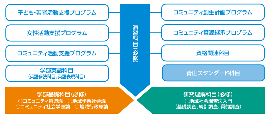 「学部基礎科目」では、「地域学習社会論」「地域行政原論」「コミュニティ創造論」「コミュニティ社会学原論」の4科目で構成し、1年次にすべて学びます。この4科目はいずれも地域社会(コミュニティ)と人間に関する原理的な理解を深める科目であり、本学部の学修の基礎となる知識を講義により修得します。